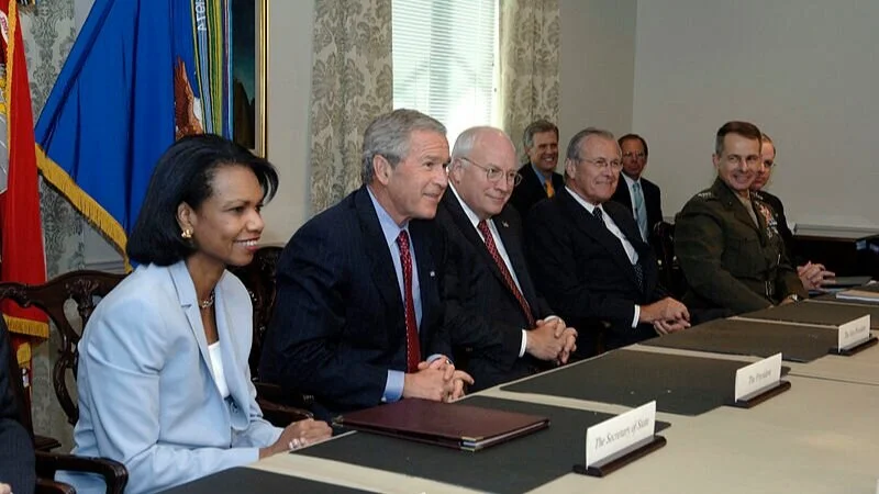 Secretary of State Condoleeza Rice, President Bush, Vice President Dick Cheney, Secretary Rumsfeld, and Chairman of the Joint Chiefs of Staff Marine Gen. Peter Pace (Pentagon, August 14, 2006)
