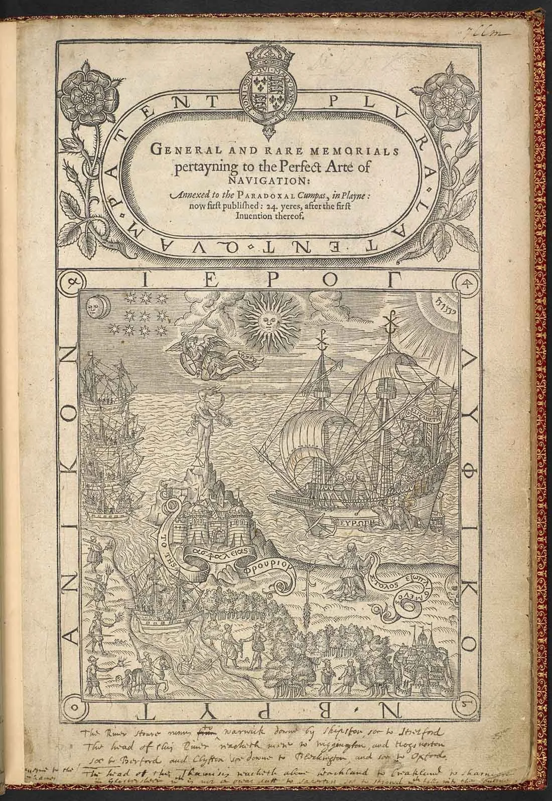 The General and Rare Memorials pertayning to the Perfect Arte of Navigation (1577) by John Dee is one of the first texts to express the idea of a “British Empire.” The title page, designed by Dee himself, Dee included a figure of Britannia kneeling by the shore beseeching Elizabeth I to protect her nation by strengthening her navy.